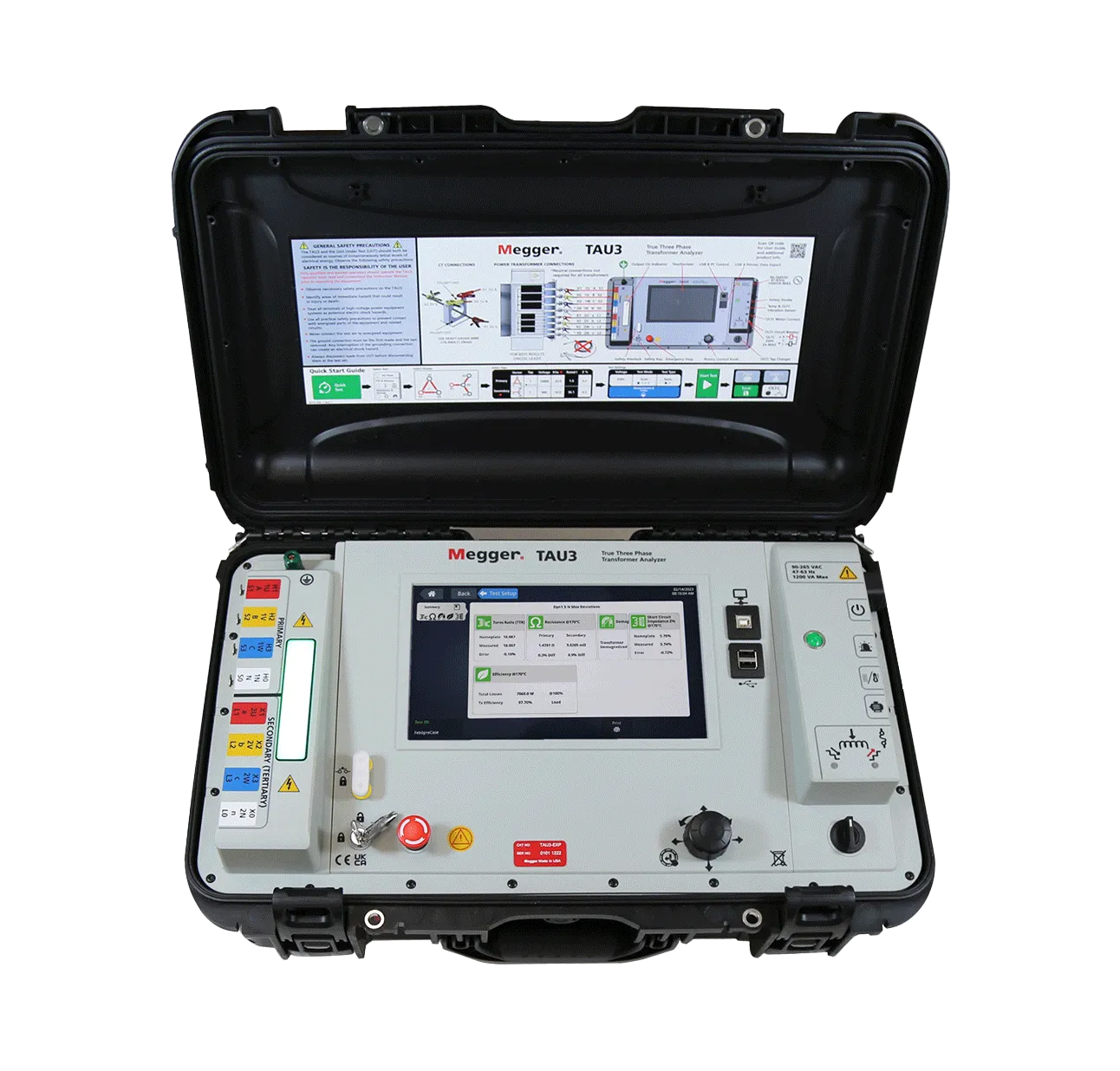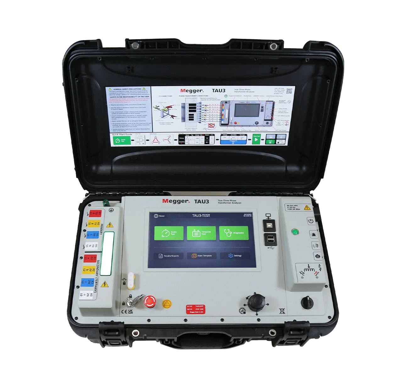 The multifunction TAU3 streamlines transformer testing with a one-time connection for all tests, reducing reliance on multiple instruments and minimising testing time, helping you maximise productivity for fast and accurate maintenance decisions. In addition to routine polarity validation, turns ratio, winding resistance, and demagnetization tests, the TAU3 offers short-circuit impedance and efficiency tests with the same one-time lead connection. Guided by colour-coded leads and clamps with on-screen vectors that match the transformer nameplate, the easy-to-follow setup ensures the right result the first time…just click ‘start’ and let the patent-pending internal shorting and lead compensation do the work!